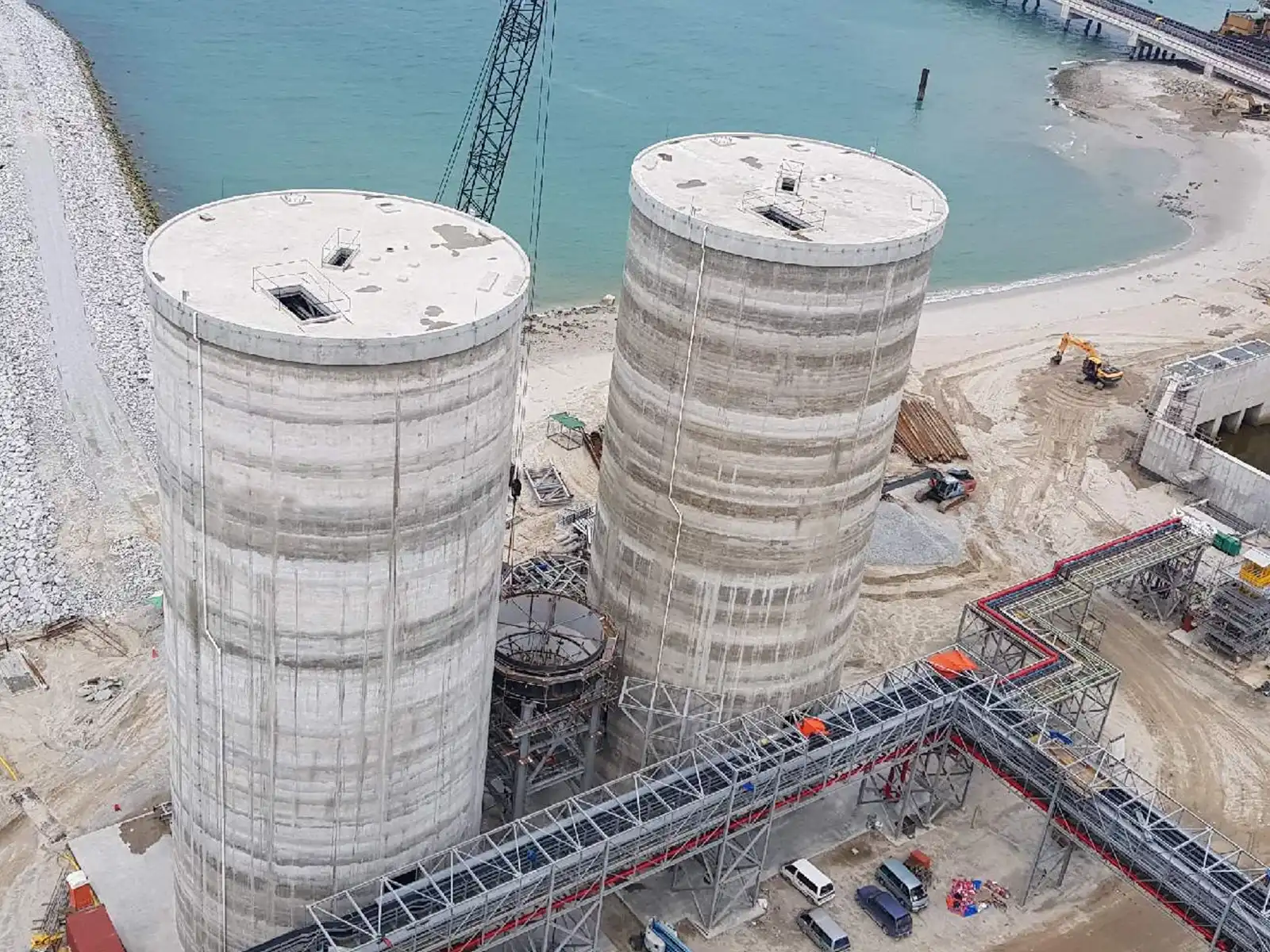 The Jimah East power project, known as the Tuanku Muhriz power station, is located in Port Dickson, Negri Sembilan, Malaysia, approximately 80 km from Kuala Lumpur. Completed in 2017, this 2×1000 MW ultra-supercritical coal-fired power plant is owned and operated by Jimah East Power (JEP), a joint venture of Tenaga Nasional Berhad (TNB), Mitsui, and Chugoku Electric Power. Hyundai Engineering Co., Ltd. was the main contractor. The plant includes twin fly ash concrete silos, each standing at 47 meters in height with an outer diameter of 19.8 meters and a storage capacity of 8900 cubic meters.