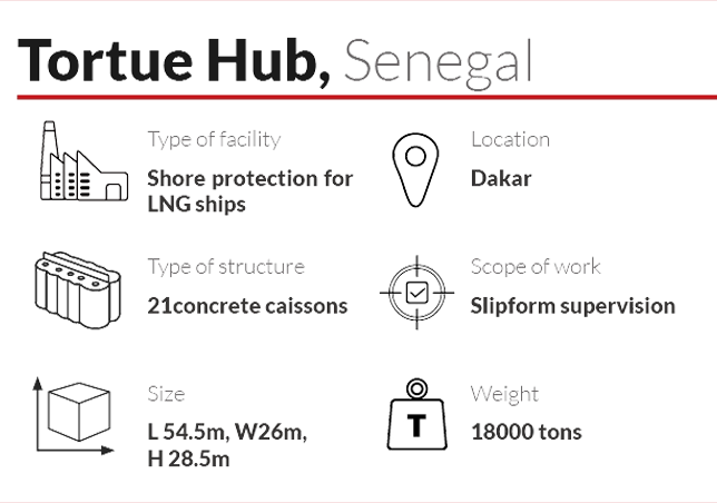 Located in Senegal, the Tortue Hub is part of BP’s Greater Tortue Ahmeyim (GTA) Development, a major LNG project on the maritime border of Mauritania and Senegal. The GTA gas field, 120 km offshore in waters 2850 meters deep, features the deepest subsea infrastructure in Africa. Eiffage Genie Civil leads the engineering design and development of the hub/terminal.